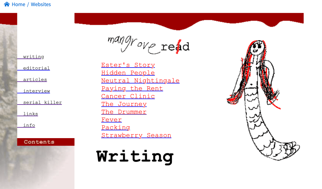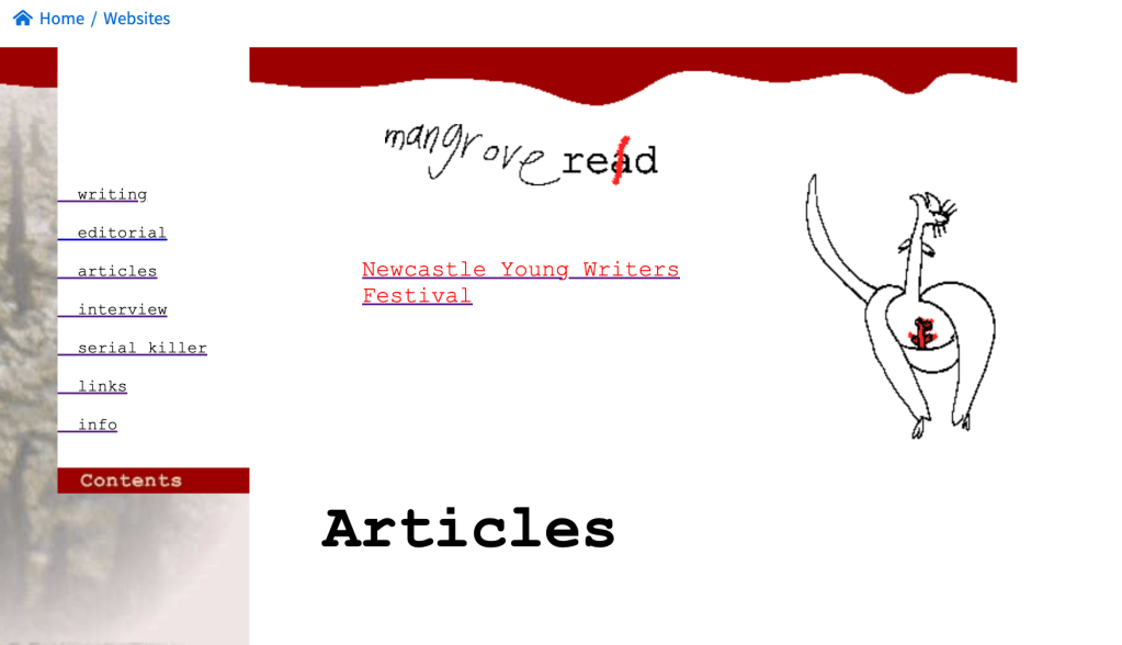 (1999.10) “Newcastle Young Writers Festival” (article). I. Woodrow (Ed.) Mangrove: Read, vol.3. University of Queensland, Brisbane, archived as a Site of National Significance in the National Library of Australia, 2000 [online].