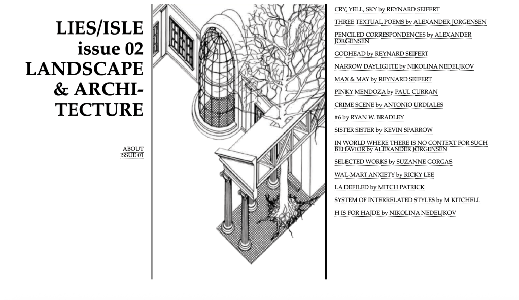 (2010.3) “Pinky Mendoza.” M. Kichell (Ed.) Lies/Isle 2: Landscape & Architecture, Chicago, US [online].