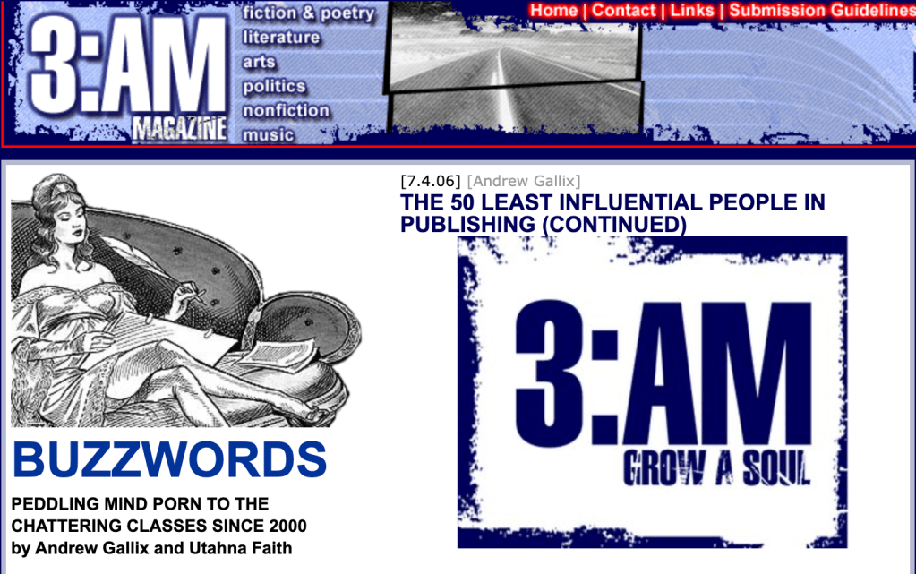 (2006.4) “The 50 Least Influential People in Publishing.” A. Gallix (Ed.) “Buzzwords,” 3:AM Magazine, London/Paris [online].
